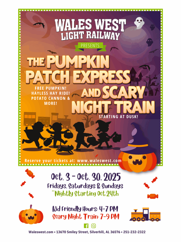 Catch The Pumpkin Patch Express! During the month of October! THERE are two sides to Halloween—a fun side and a scary side. And you can choose either one at Wales West!You can choose the Kid-Friendly version of The Pumpkin Patch Express or—if you’re up for it—you can ride the Scary Night Train!Get your tickets in advance online using our secure, online ticket app for The Pumpkin Patch Express. Wales West RV Park and Light Railway13670 Smiley Street, Silverhill, AL 36576251-232-2322